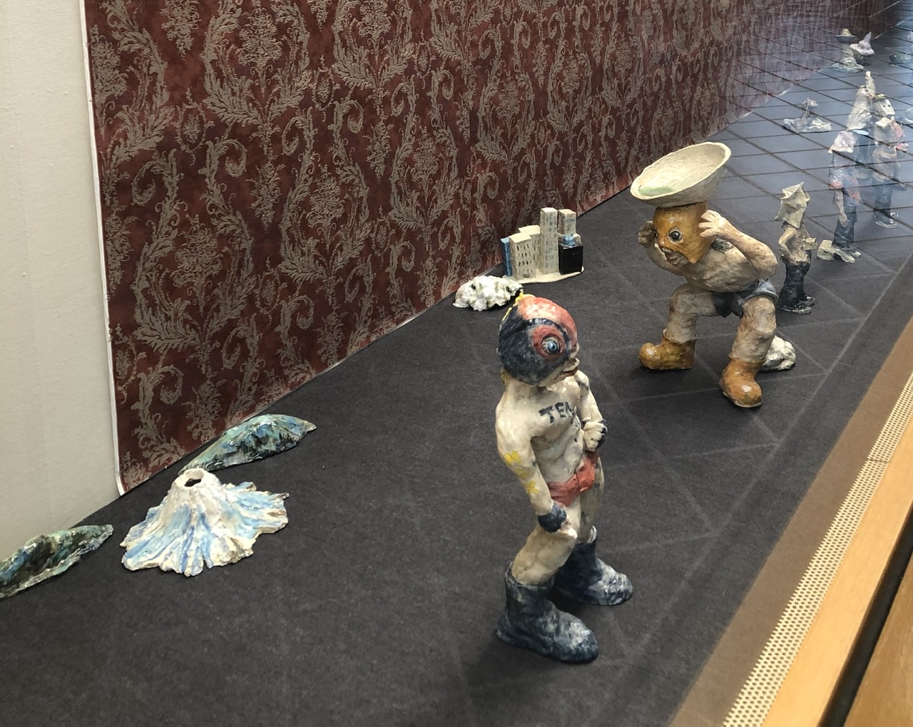 陶のジオラマと、アクリル板に描かれた絵で架空のナガクテ史を展示します。展示会場は合わせ鏡になっているのでジオラマの一部になりながら楽しんで観てください。